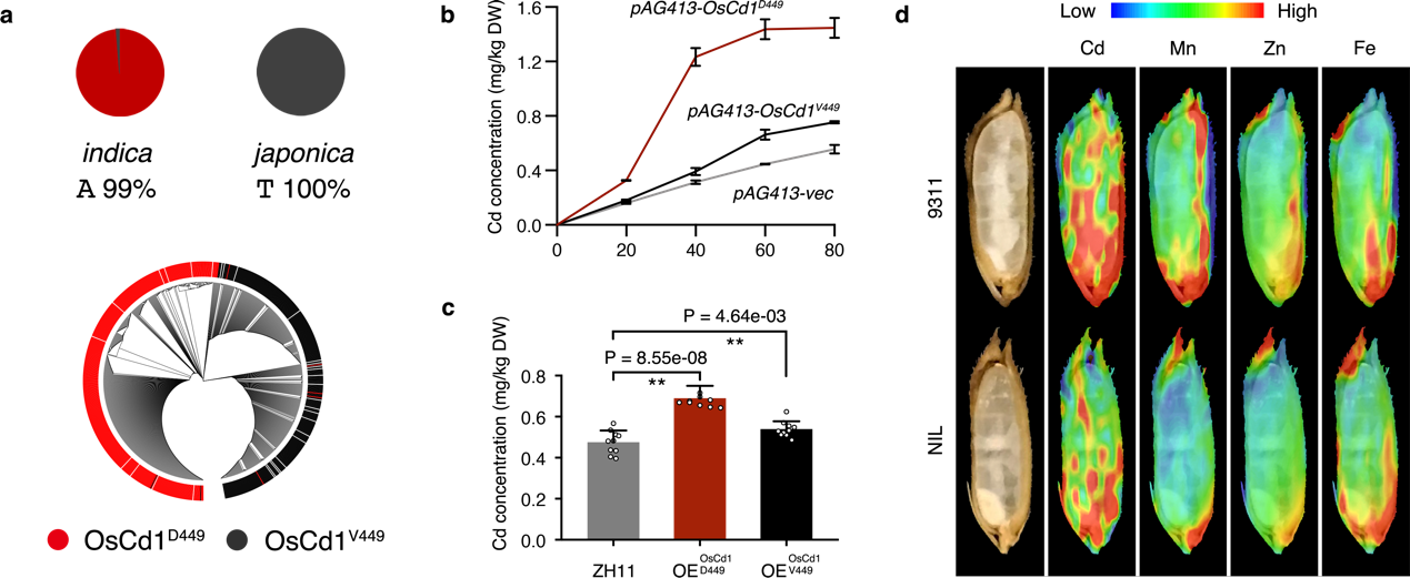 中國科學院植物研究所何振豔研究組及其合作者利用全基因組關聯分析技術和基因功能驗證體系,初次鑑定到一個參與鎘轉運的主要協助轉運蛋白超家族(major facilitator superfamily,MFS)成員OsCd1。研究發現,OsCd1為鎘的次級主動轉運蛋白,主要在水稻根的質膜上表達,其缺失可顯著降低水稻對鎘的吸收效率和籽粒鎘積累量,説明該基因參與了水稻根部鎘吸收和籽粒鎘積累過程。進一步研究表明,在秈稻和粳稻中,OsCd1基因型出現顯著分化,其中OsCd1V449主要在粳稻中存在,其鎘轉運能力顯著低於秈稻基因型OsCd1D449;田間試驗表明,將粳稻基因型OsCd1V449導入秈稻品種後,含有OsCd1V449的水稻近等基因系籽粒鎘含量可顯著降低,表明OsCd1V449基因型在低鎘秈稻育種方面具有很大的應用潛力。