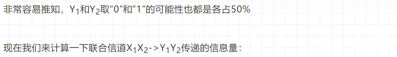 其可取的值為{0,1};這兩個信號進行模2加(模2加的規則是:0+0=0;0+1=1;1+0=1;1+1=0)後,則送入一個噪聲信道W,其有60%的可能性維持原有的值輸出到Y1,40%由於干擾而被誤判成另一個符號(即“0”被判成“1”, “1”被判成“0”);另外,X2直接通過一個干擾信道W,輸出為Y2。