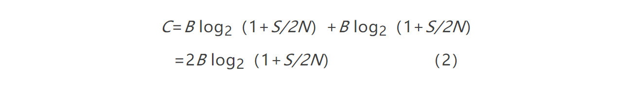如果這個模型是無線電傳輸的,則信道的噪聲N不會變化。信號總功率還定為S,每個信道各分一半,即S/2。那麼我們很容易推算,這個信道的總容量為: