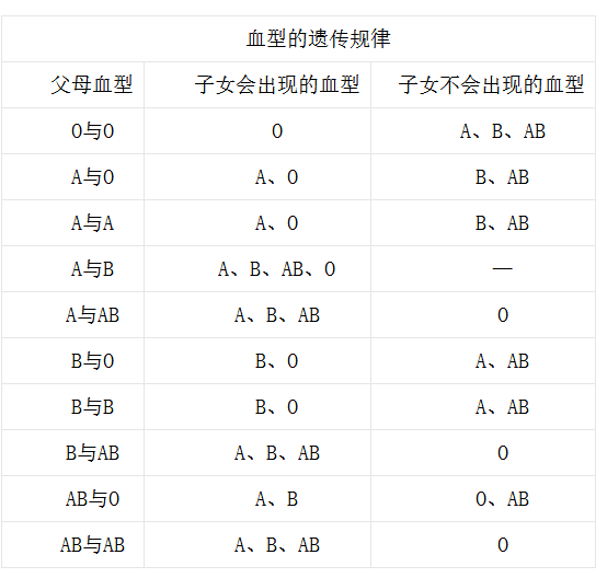 從下面所附的血型遺傳規律表中我們可以看出:父母和子女的血型對應關係是比較複雜的。