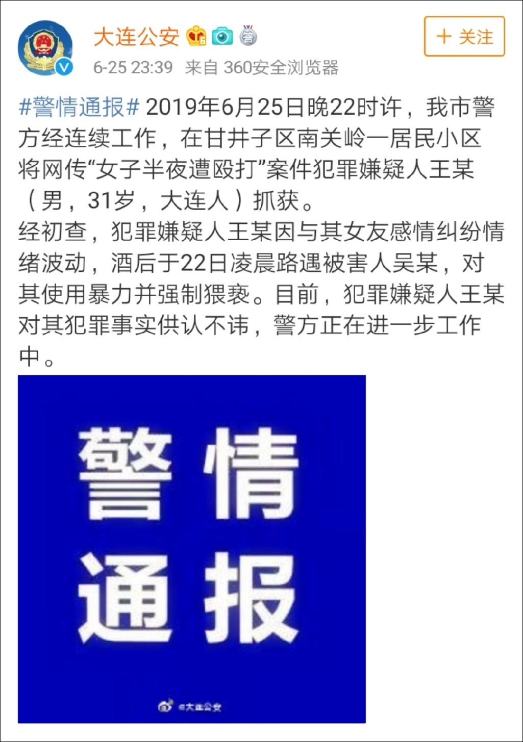 2019年6月25日晚22時許,我市警方經連續工作,在甘井子區南關嶺一居民小區將網傳“女子半夜遭毆打”案件犯罪嫌疑人王某(男,31歲,大連人)抓獲。**經初查,犯罪嫌疑人王某因與其女友感情糾紛情緒波動,酒後於22日凌晨路遇被害人吳某,對其使用暴力並強制猥褻。**目前,犯罪嫌疑人王某對其犯罪事實供認不諱,警方正在進一步工作中。