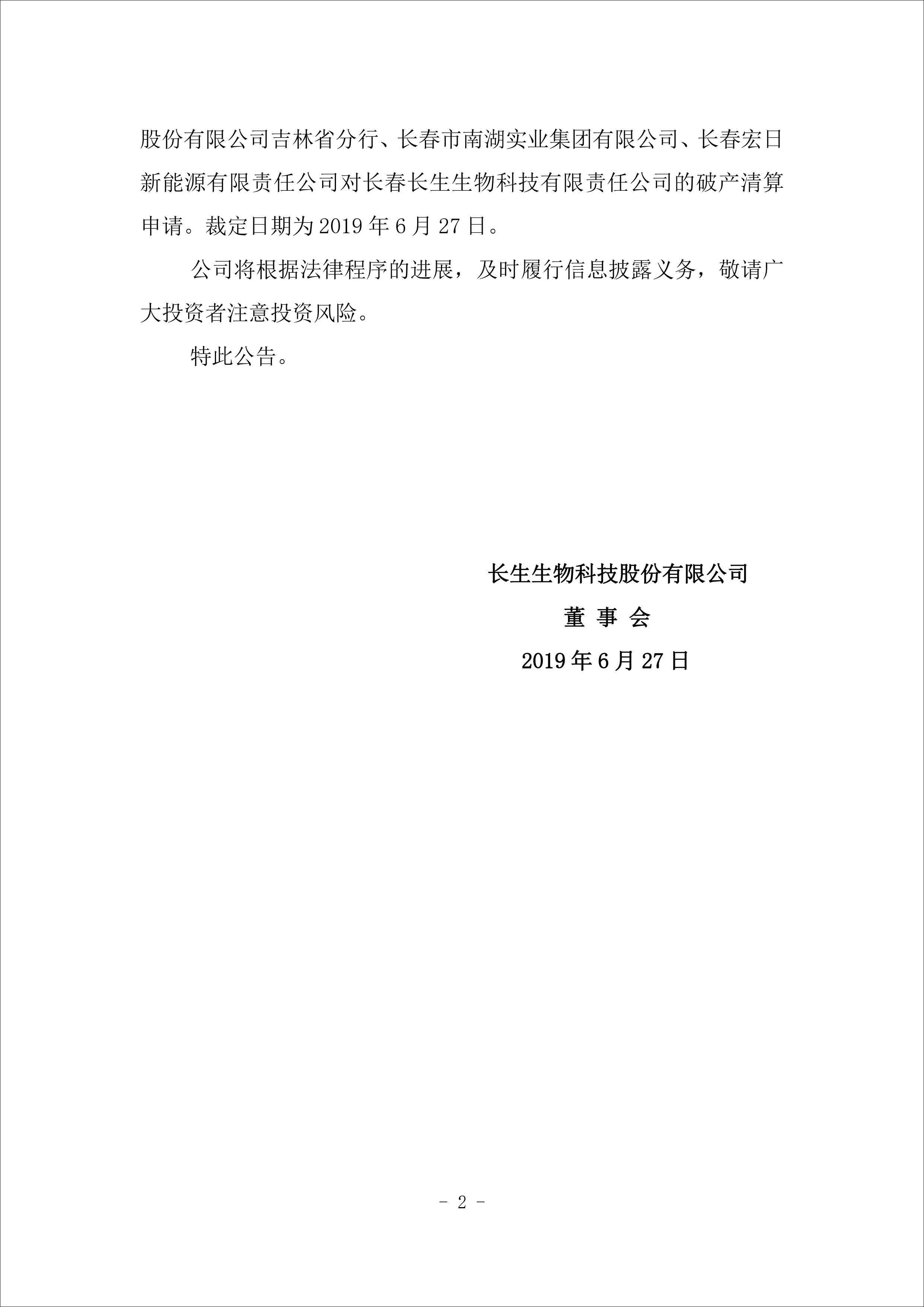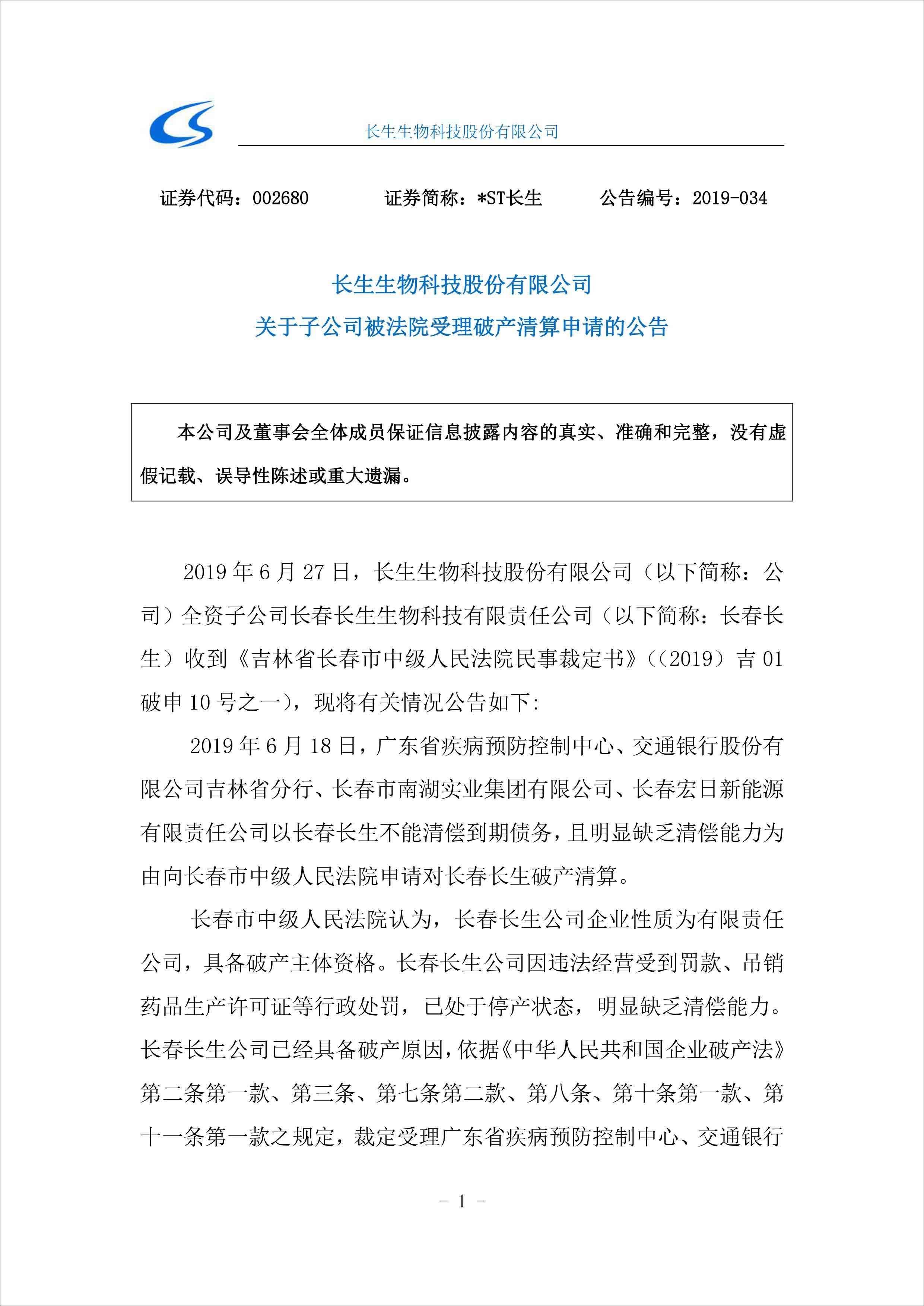 2019 年 6 月 27 日,長生生物科技股份有限公司(以下簡稱:公 司)全資子公司長春長生生物科技有限責任公司(以下簡稱:長春長 生)收到《吉林省長春市中級人民法院民事裁定書》((2019)吉 01 破申 10 號之一),現將有關情況公告如下: