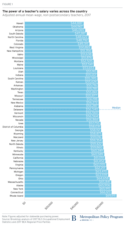 美國教師年收入的購買力差異很大。2017年,教師工資中值為特拉華州,平均年薪為56,540美元(根據全州的生活成本進行調整)。當年夏威夷教師的工資最低的,平均調整後工資為44,887美元。羅德島州教師調整後的收入最高,為69,911美元。