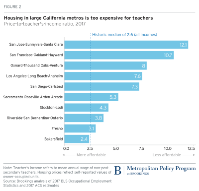 在加州,以教師的薪水買房更是難上加難。衡量住房負擔能力的一個典型指標是房價與收入之比,即當地房價與收入之比。根據歷史中值,購房者的典型經驗法則是,2.6或更低的比例才是他們認為可以負擔得起的。儘管不同地區的房價差異很大,但如果我們考慮“房價與教師收入之比”,就會發現,在加州最大的城區,典型的新房主的收入必須是當地教師工資的許多倍。
