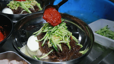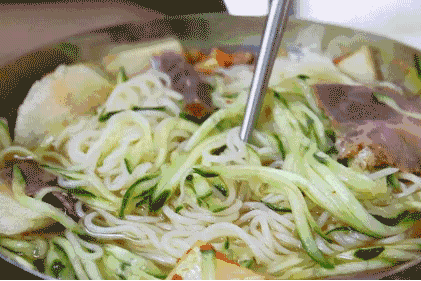 延吉冷麪湯上常常飄着一層冰碴子。延吉人吃**蕎麥麪現壓的冷麪,**勁道無雙。店家還會給你配把剪子,方便你剪幾下再吃。
