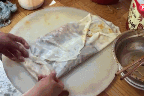 別人家的涼皮切來條拌,濮陽人的涼皮**裹着吃。**裹涼皮不是放大版的越南春捲,是滿滿的實在啊!用來裹的涼皮要厚薄均勻,太厚看不到內餡,太薄容易撐破撒一手湯。