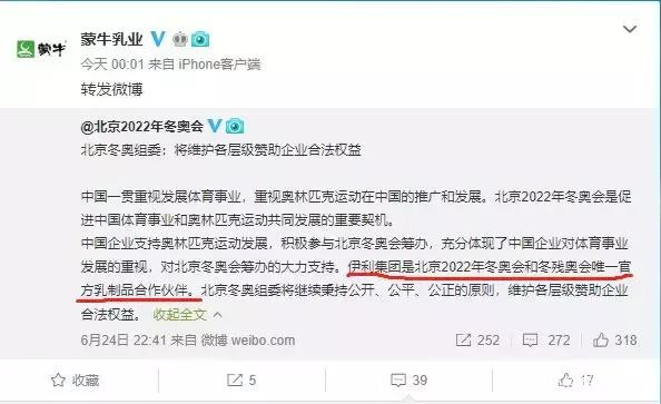 也許是考慮到伊利獲得北京冬奧會唯一官方乳製品合作伙伴身份在先;也許是對自己獲得奧運贊助商身份的方式不甚自信,在25日凌晨,蒙牛乳業官方微博同樣轉發了北京冬奧組委的微博。從某種意義上,這一轉發可能意味着蒙牛對伊利冬奧會和冬殘奧會唯一官方乳製品合作伙伴身份的認可。前一天剛剛砸出30億美元,次日凌晨就要在自己的官微平台承認“伊利集團是北京2022年冬奧會和冬殘奧會唯一官方乳製品合作伙伴”,想必此時的蒙牛內心也是感慨萬千。