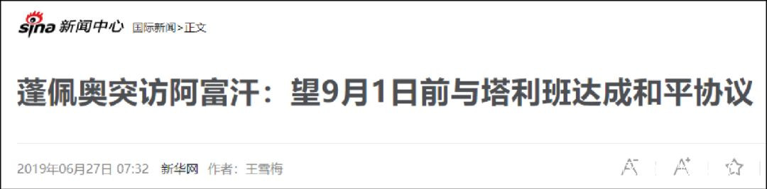2019年6月25日,美國國務卿蓬佩奧突訪阿富汗首都喀布爾,聲稱與塔利班在反恐問題上的談判已取得很大進展,希望能在今年9月1日之前達成和平協議,然後,撤兵。