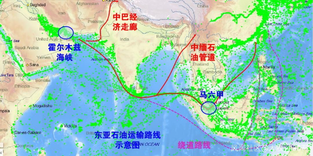 這裏特別説明一下:**如果美國不能控制霍爾木茲海峽,那麼無論如何都圍不住中日韓和印度的石油進口。****印度就不用説,可以直接運輸;**對於中日韓來説,美國即使控制馬六甲海峽,以各種理由封鎖馬六甲海峽,那麼中國也可以通過中巴經濟走廊、中緬石油通道或繞道馬六甲,只不過是代價大點而已。