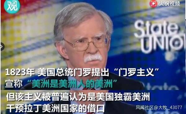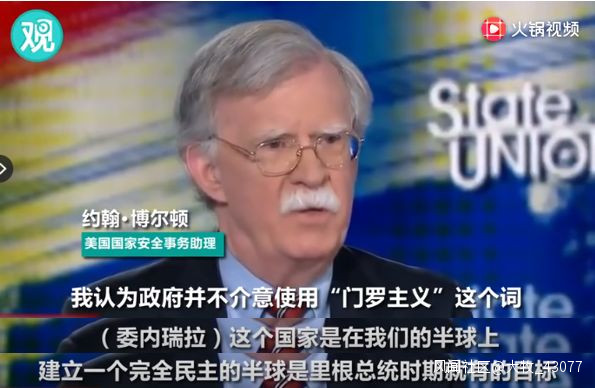隨後,美國國家安全事務助理博爾頓説道:“我們(美國政府)不介意使用‘門羅主義’這個詞。這個國家(委內瑞拉)在我們的半球,里根總統時代的目標就是建立一個完全民主的半球。”