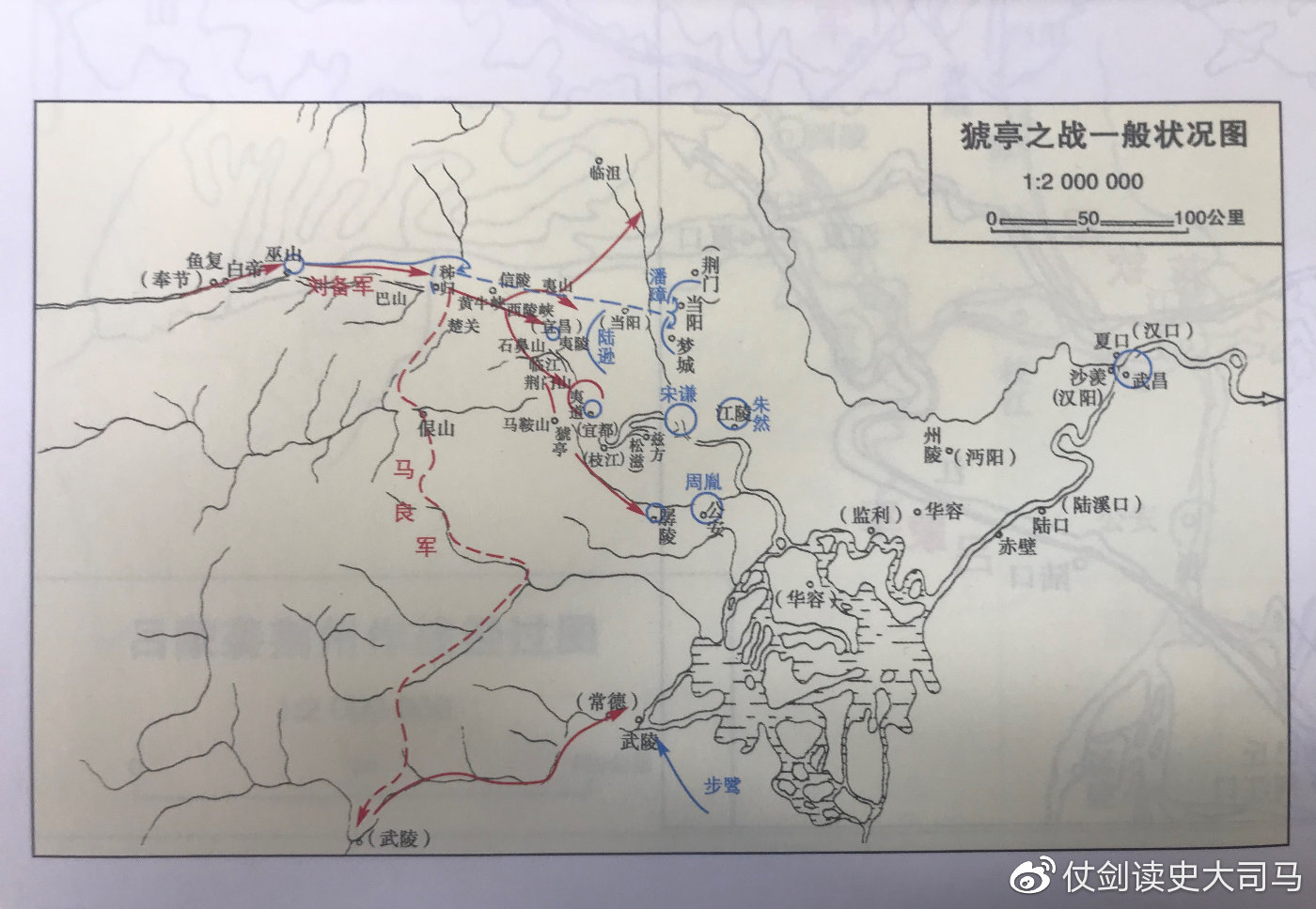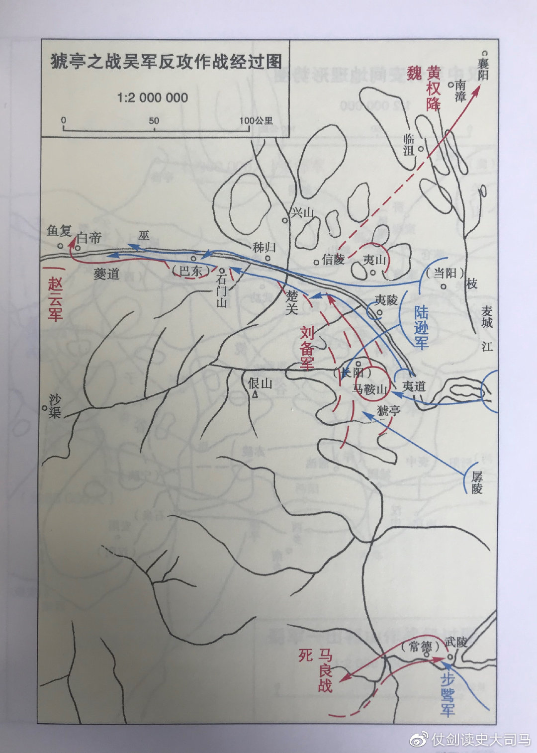 戰役經過不用多説,大家耳熟能詳:起初蜀漢進兵順利,吳班、陳式率水軍自秭歸順流以攻夷陵,以黃權為鎮北將軍,屯兵長江兩岸。劉備親率主力從秭歸進抵猇亭,立營數十屯。漢軍深入吳境二三百公里,在巫峽至夷陵一線數百里地上設立了幾十個營寨。