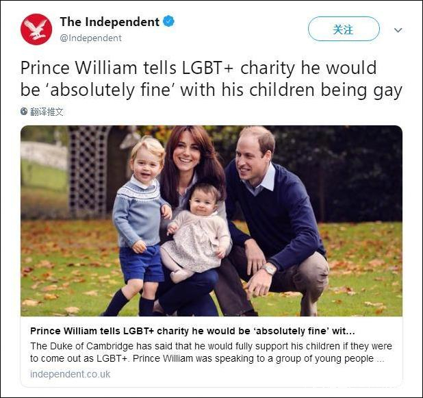 據瞭解,身為英國王位的第二順位繼承人,威廉和凱特王妃於2011年4月29日成婚,婚後育有二兒一女:喬治王子、夏洛特公主和1歲有餘的路易王子。英國王室內,此前還沒有哪一位成員在公開場合談論過LGBT羣體的議題。