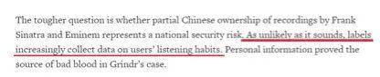 至於這“從中作梗”的方式,路透社則分析認為美國權力龐大的外國投資委員會(CFIUS)可能會將這家擁有被中國歌迷暱稱為“黴黴”的美國知名歌手泰勒⋅斯威夫特(Taylor Swift)以及Lady Gaga等眾多美國一線歌手的唱片公司及其下藝人視為美國重要的“戰略資產”,然後宣稱這家唱片公司及其藝人團隊所蒐集的美國人在聽歌方面的個人數據“涉及國家安全”,進而就可以以此作為在貿易上要挾中國的“籌碼”了…..