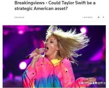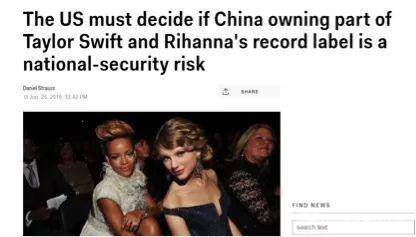 6月26日,英國路透社撰寫了一篇非常“魔幻”的評論文章,稱在中國備受年輕人喜愛,更被暱稱為“黴黴”的美國知名歌手泰勒⋅斯威夫特(Taylor Swift),乃至包括Lady Gaga,愛莉安娜⋅格蘭德(Ariana Grande,被中國粉絲暱稱為“A妹”)、蕾哈娜(Rihanna)在內的一系列美國一線歌手,恐怕都要被美國政府視為“戰略資產”,不許中國企業投資她們所屬的唱片公司了……