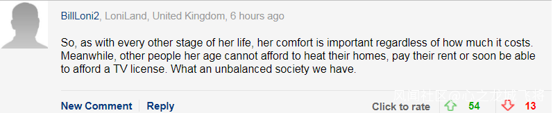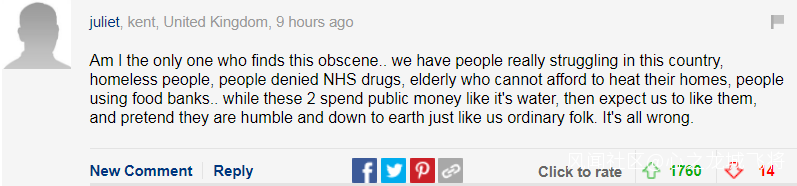 我是唯一一個認為這很可惡的人嗎…在這個國家,我們有很多人確確實實在苦苦掙扎,有無家可歸的人,沒有國民健康保險制度提供的藥品的人,家裏買不起暖氣的老年人,使用食品銀行的人……而這兩個人花錢如流水,卻期望我們喜歡他們,假裝他們和我們普通人一樣謙虛、腳踏實地。這都是錯誤的。