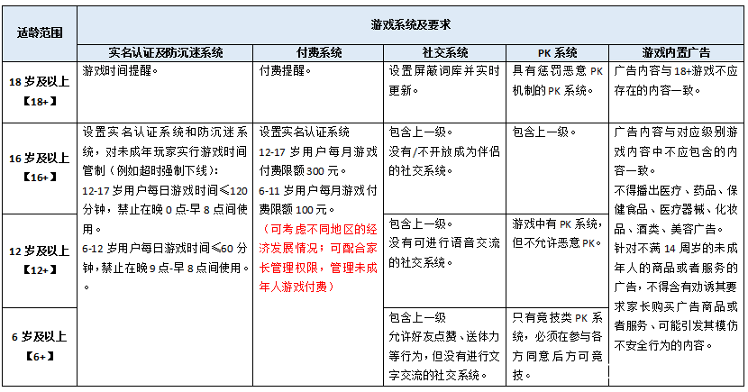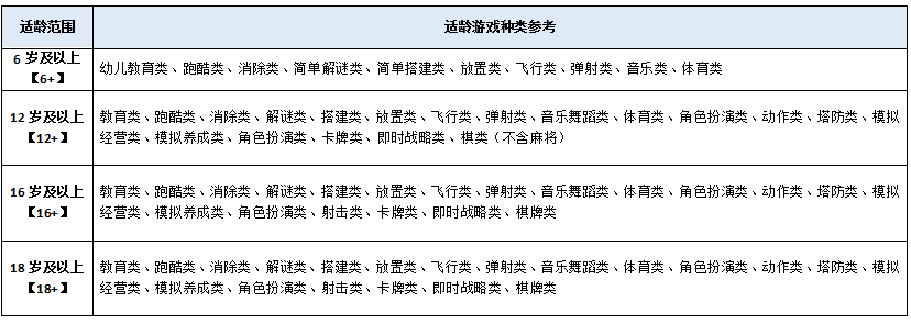 根據中國現行法律規定和青少年成長過程中的生理特徵、認知能力、道德水平綜合考慮,將遊戲適齡範圍劃分為“18歲以上(18+)”“16歲以上(16+)”“12歲以上(12+)”“6歲以上(6+)”四級。因6歲以下兒童正處於視力發育等的關鍵時期,不建議他們單獨使用電子產品進行遊戲。