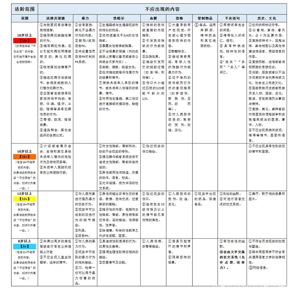 人民網隨後公開了《遊戲適齡提示草案》的細則,以及具體不同年齡段下不應出現的內容,下面是草案原文:
