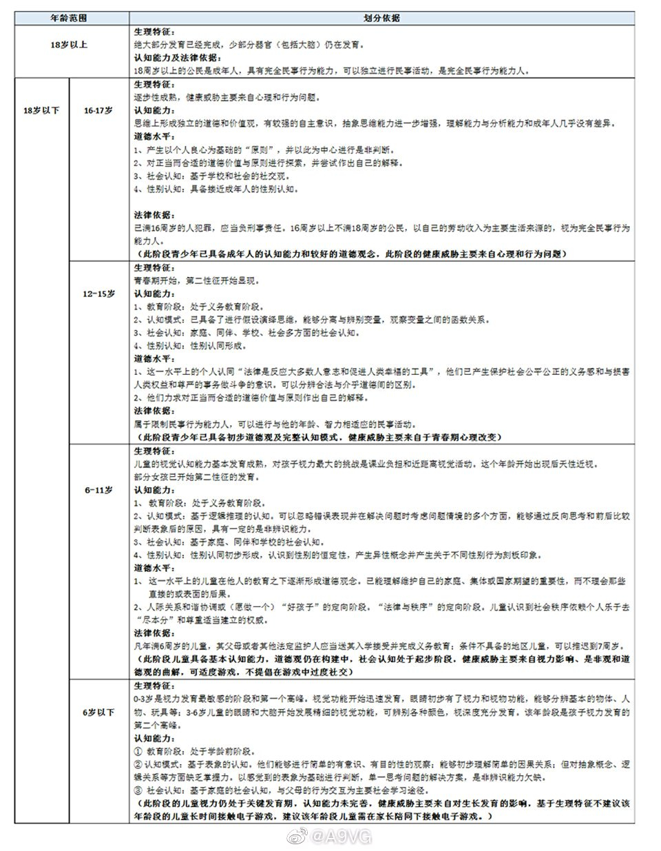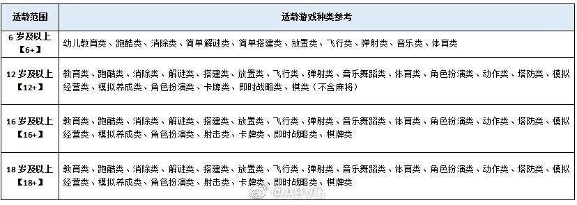 根據現行法律規定和青少年成長過程中的生理特徵、認知能力、道德水平綜合考慮,草案建議將遊戲適齡範圍劃分為四個等級(6歲以下兒童處於視力發育等的關鍵時期,不建議他們單獨使用電子產品進行遊戲):