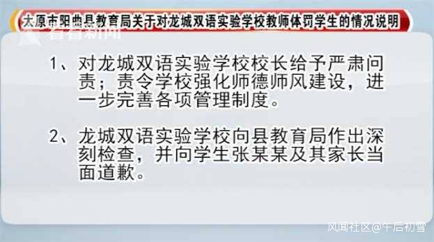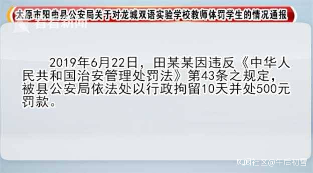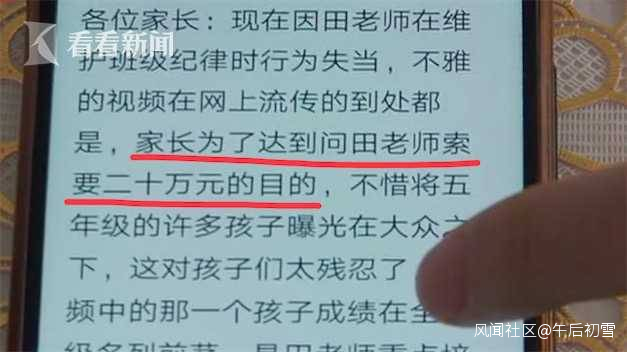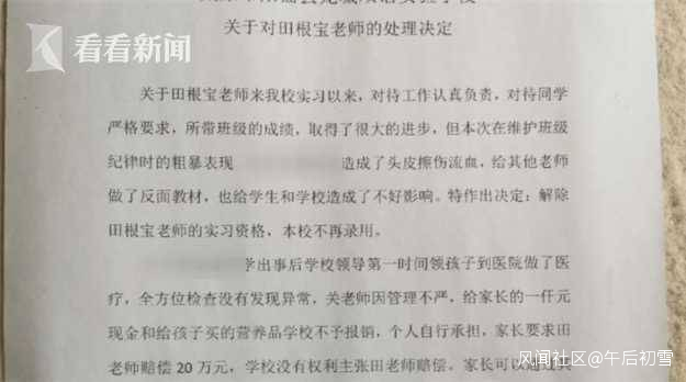 兩天後,小軍的爸爸得知,田老師已被校方辭退。校方同時發佈了一條公告,大概內容是:小軍爸爸為了達到問田老師索要20萬元賠償的目的,不惜發佈視頻,把許多孩子曝光在大眾之下,田老師也成為不知內情人士口誅筆伐的對象,田老師是有錯,但不應受這麼嚴重的懲罰。