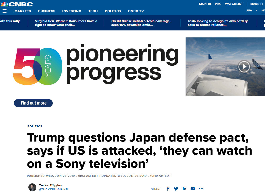 特朗普:日本遭襲,我們要拼命保護,美國遭襲,他們卻可只在索尼電視上看2019-06-27 08:35 環球網 烏元春 【環球網報道 記者 烏元春】在出發前往日本參加G20峯會的幾個小時前,當地時間週三(26日),美國總統特朗普接受美媒採訪對美日簽訂的長期防務協議的公平性提出了質疑。