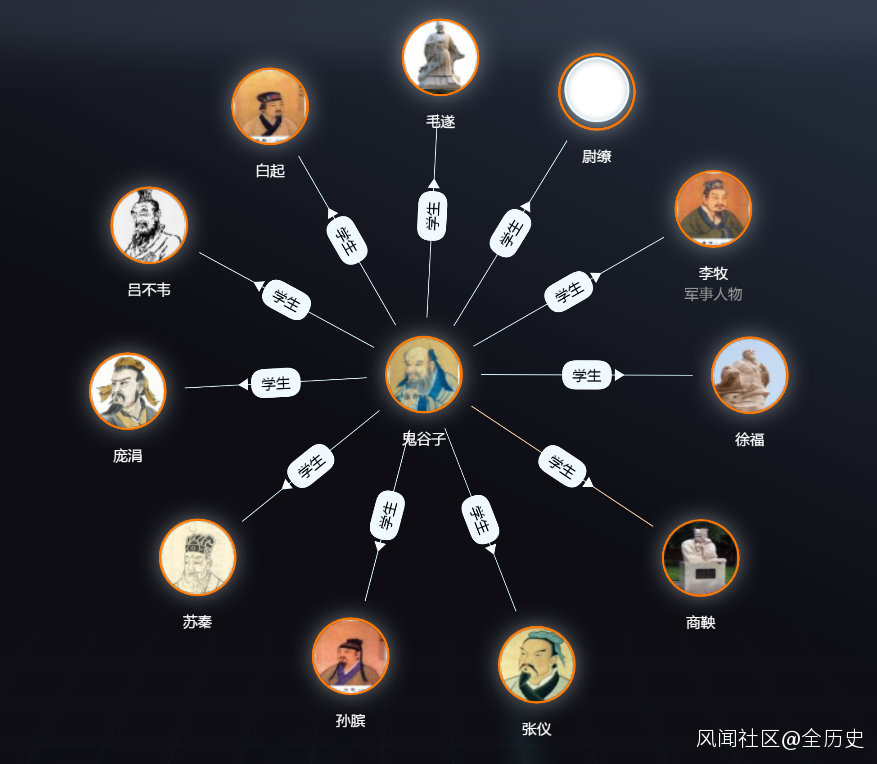 據不完全統計,蘇秦、張儀、孫臏、龐涓、商鞅、李斯、呂不韋、白起、李牧、王翦、徐福、毛遂、范蠡、甘茂、樂毅、范雎、猗頓、蔡澤、鄒忌、黃石等500多位精英,都出自鬼谷子門下。