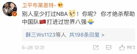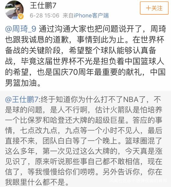6月28日中午,前男籃國手@王仕鵬7 更新微博,疑似炮轟某球員耍大牌。
