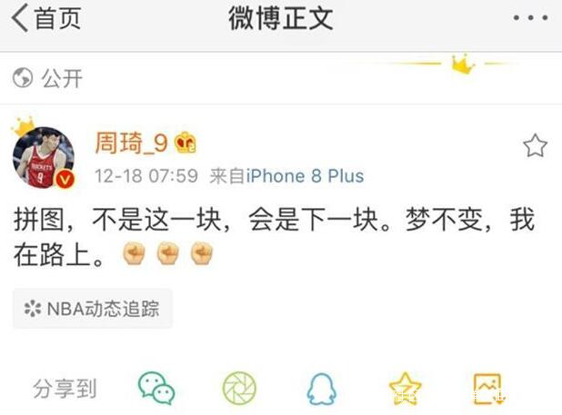 當時周琦也在個人微博上回應:拼圖,不是這一塊,會是下一塊。夢不變,我在路上。