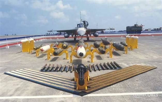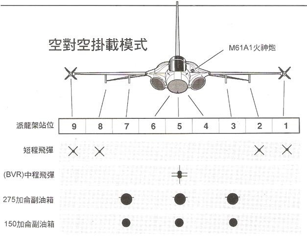 對空作戰:機腹半埋掛載2枚天劍II型,翼尖和翼下外側掛載4枚天劍I型。同時機內攜帶約550加侖燃油,翼下內側掛載2具1040升副油箱。