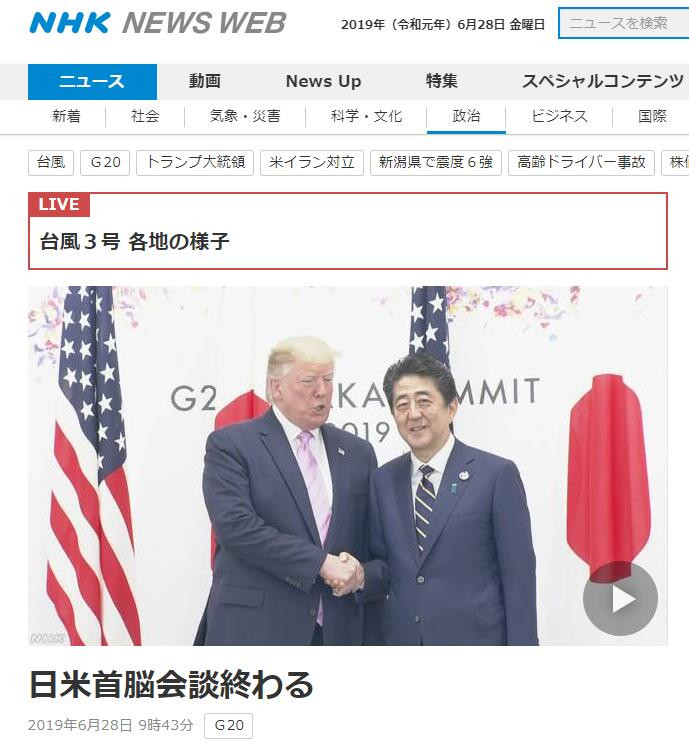 NHK報道稱,安倍在發佈會上對媒體表示:“我4月份訪問了美國,特朗普總統上個月作為國賓訪問了日本,現在G20峯會又來了。在短時間內日美首腦的多次往來證明了日美同盟的堅固。特別是在上個月,(特朗普)作為令和時代的第一位國賓來到日本,我再次表示感謝。”
