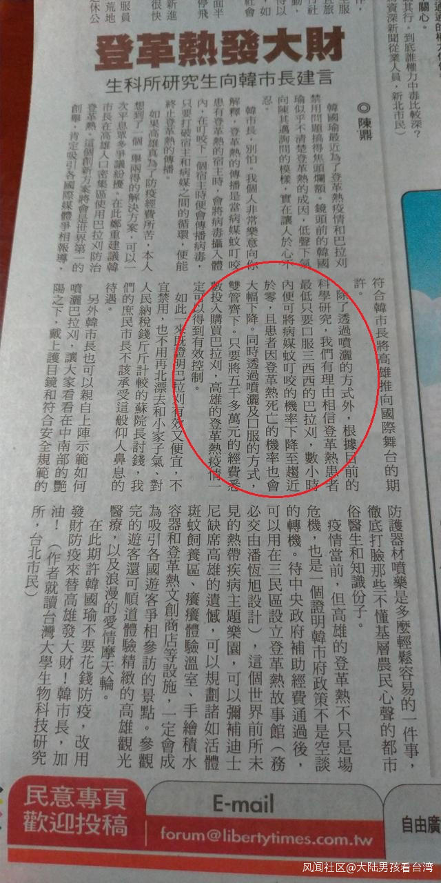 當天,該報在其《自由廣場》欄目上刊登了一篇讀者的投稿文章。文章題為《登革熱發大財》,文章作者為陳鼎,是台灣大學生物科技研究所的一名在讀研究生。