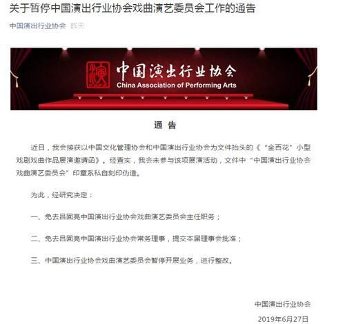 27日,中國演出行業協會通過微信公眾號宣佈,暫停中國演出行業協會戲曲演藝委員會工作。