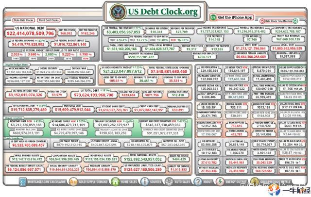 一牛財經查看美國實時的債務數據顯示,目前美國負債為22.414萬億美元,這佔2018年美國GDP(20.5萬億美元)的109%,如下圖所示: