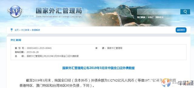 據外管局公佈的最新數據顯示,截至2019年 3 月末,我國全口徑(含本外幣)外債餘額為132762億元人民幣(等值19717億美元,不包括港、澳、台地區對外負債),較2018年末增長65億美元,增幅0.3%。