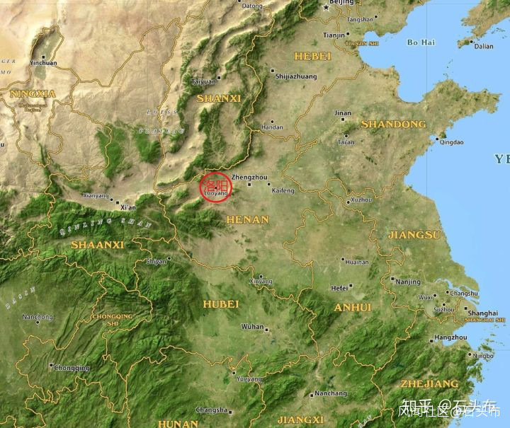 但洛陽盆地這個地方匯聚了二里頭遺址、偃師商城、周洛邑王城、漢魏隋唐洛陽城等等眾多古代都城,還是有其原因的。只是這個原因與它是否地理中心無關,而是在於其獨特的山川形勢。我們來把地圖放大,看看洛陽附近的地形。