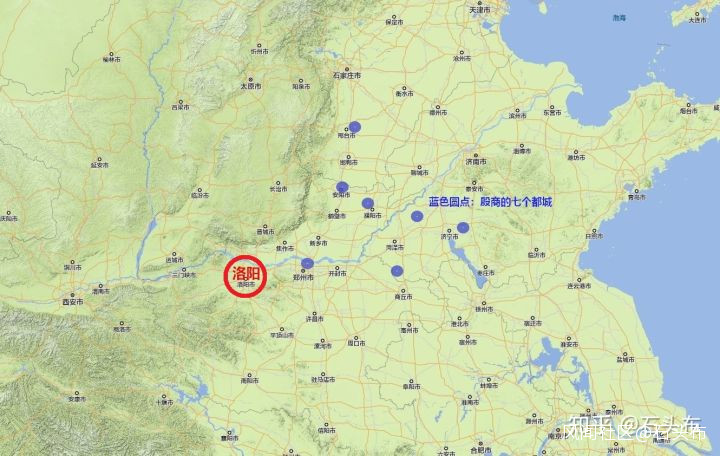 洛邑(故址在今洛陽市西郊),乃至後世的洛陽,位於豫西山地之中的一個盆地之內。這個地方叫做“洛陽盆地”,四面環山,僅有內部很小的一點平地。從地理大形勢上看,洛邑位於平原與山地的分界線上。洛陽以西,基本上是莽莽羣山,僅以黃河谷地為通道,與另一塊被山地封閉的狹窄平原——關中平原(號稱“八百里秦川”)相聯繫。而洛陽以東,則是肥沃寬廣、平坦無際的華北大平原——當時人口和文化的繁盛之地。殷商的七個都城(圖二中藍色圓點所示)都位於這個區域之內,那裏才是當時已知的“天下”的中心地帶。