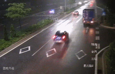 萬某急急忙忙看了一下被雨水打濕的倒後鏡,向左轉出,避開這輛大貨車。