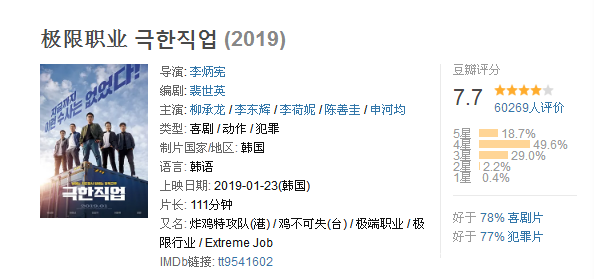 韓國上半年票房冠軍是《極限職業》,又被譯作《雞不可失》。