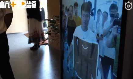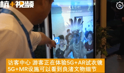 遊客們只要站在大屏幕前,動動手就能套上麻衣、羽冠,變身成體驗了良渚王或者良渚王后,上演一場5000年前的時裝秀…
