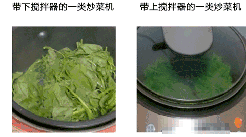 那時國產炒菜機普遍還是槳葉式的,容易導致炒長根莖的蔬菜時,攪拌失敗整體旋轉(圖片來自爸爸小炒機的廣告文案):
