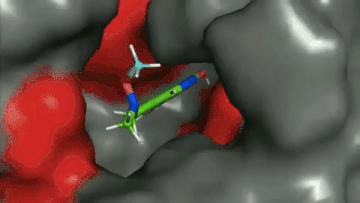 比如在下面這個模擬動圖裏,Gavilán 用連續運動來準確預測紅色顯示的抗性突變,同時使用其基於片段的藥物發現技術,來設計藥物以克服細胞抗藥性。最終,Gavilán 找到了一塊沒有良好抗性突變的片段。在這個基礎之上,Gavilán 進一步改進藥物,以增加其親和力(affinity)及特異性(specificity)。