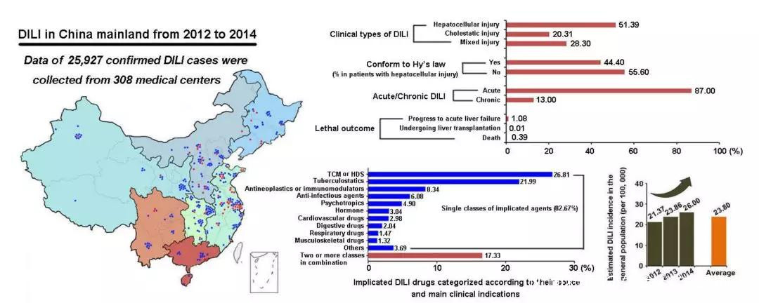 作為國內迄今最大規模的DILI流行病學研究,該研究基於“Hepatox” 網絡平台,共納入中國大陸地區2012~2014年共308家醫院的25927例DILI患者,採用RUCAM量表評估患者的流行病學資料與發生DILI的因果關係。