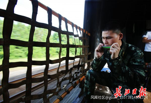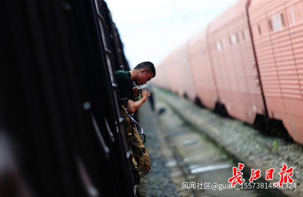 火車臨時停靠,押運官兵抓緊時間洗漱。