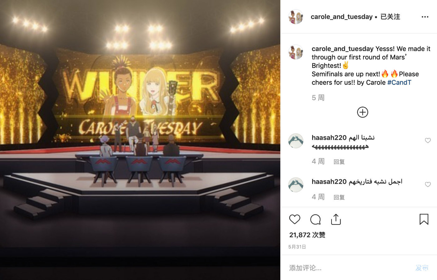 是的,發佈這張照片的人正是女主角之一的Carole,這段文字更像是她第一次參加完選秀節目後所發表的“勝利感言”,也是對動畫內容的有效補充。而在這張圖片的留言區,來自世界各地的粉絲們,都發自內心地表達了自己對兩位動畫角色獲得勝利的祝賀。