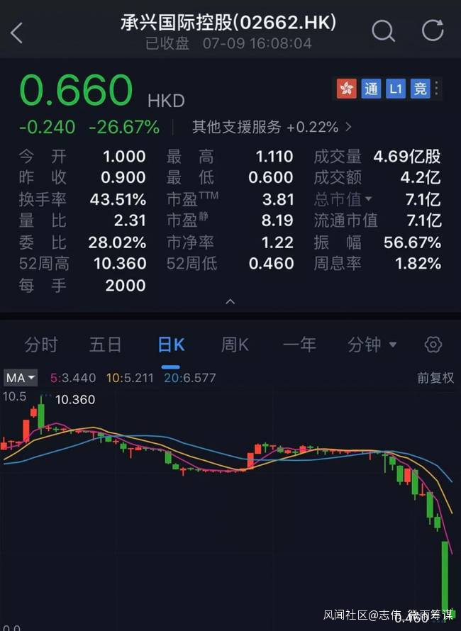 但港股公司——承興國際控股(2662HK)則繼續暴跌,尾盤大跌27%,報0.66港元。而7月8日已經暴跌超過80%,從4港元的開盤價直接跌到0.9港元。