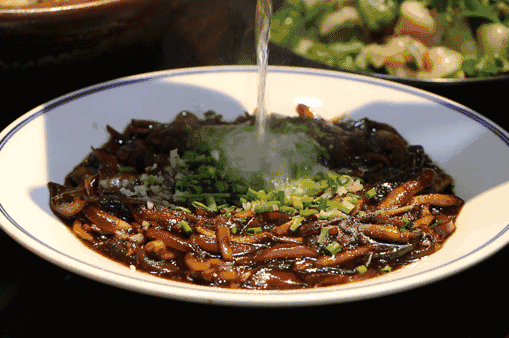 炒熟的鱔絲放入盤裏,中間留出空間鋪上葱花蒜末,澆上燒熱的豬油,鱔絲葱花蒜末刺啦響,聲音和香氣便一起出來了。