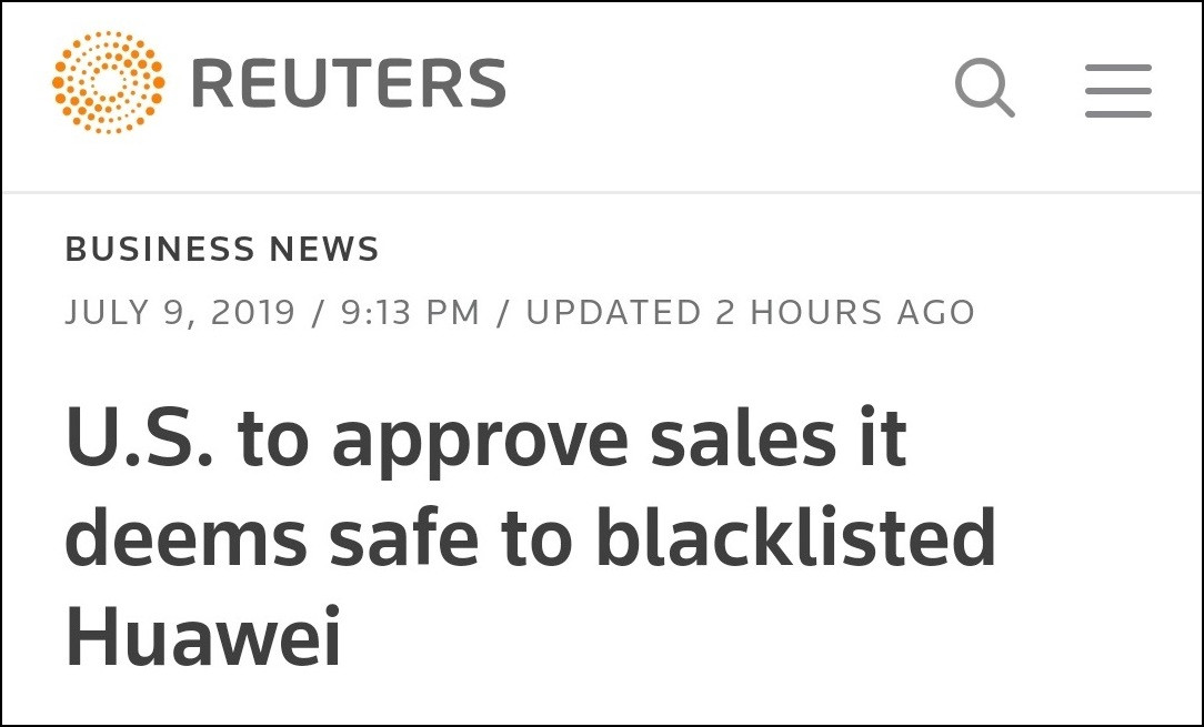 在兩週前的G20峯會上,特朗普在回答記者問時表示,美國沒有把華為從商務部的出口管制黑名單中去除,但允許美國公司向華為出售產品。