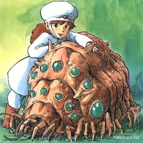 《風之谷》算是宮崎駿科幻色彩最濃的一部作品了,尤其是其中的王蟲荷母,它是腐海中人造蟲類之一。體型龐大,有十幾隻眼睛,情緒反應簡單,還會通過眼睛顏色的轉變來表現情緒。而具有終極破壞力量和高度智能的人造生物巨神兵也屬於此類。
