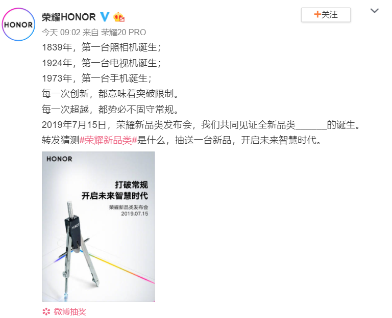 從榮耀官方這條微博來看,7月15日這場溝通會的主題將會是“打破常規,開啓未來智慧時代”, 海報中使用圓規畫方也體現出榮耀新品類打破常規的非凡突破。而在微博文案中,榮耀即將發佈的新品類和照相機、電視機、手機等科技發展進程中的偉大發明並列,看得出榮耀對新品類底氣十足。榮耀究竟將發佈什麼智慧新品類,將會有什麼樣的劃時代意義,引起了人們的巨大期待。