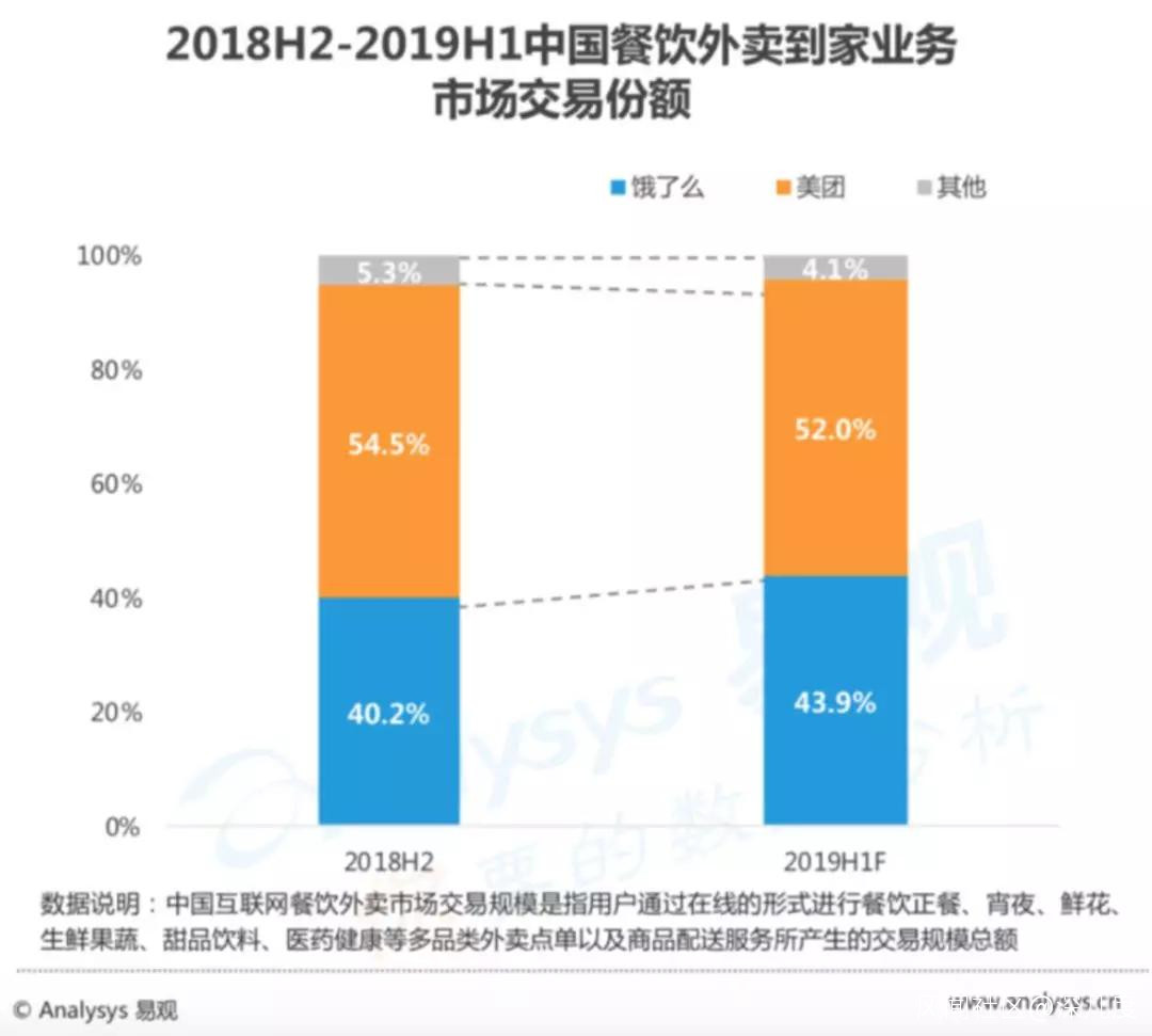 今年6月,Analysys易觀近期公佈的數據顯示,中國本地生活服務市場2019上半年的線上交易規模達到9159.8億元。餓了麼市場份額達43.9%。餓了麼和美團外賣的市場份額基本實現了五五開。