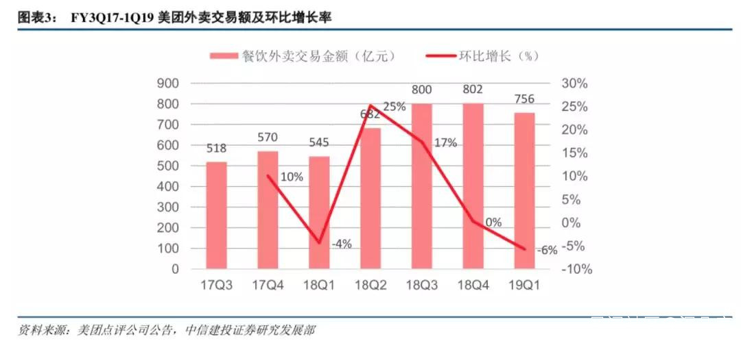 2018年Q4之後,美團外賣的環比交易額增長几乎就停滯不前,一季度為外賣的傳統淡季,受春節假期的影響,許多餐廳暫停營業,下降幅度也基本符合歷史趨勢。